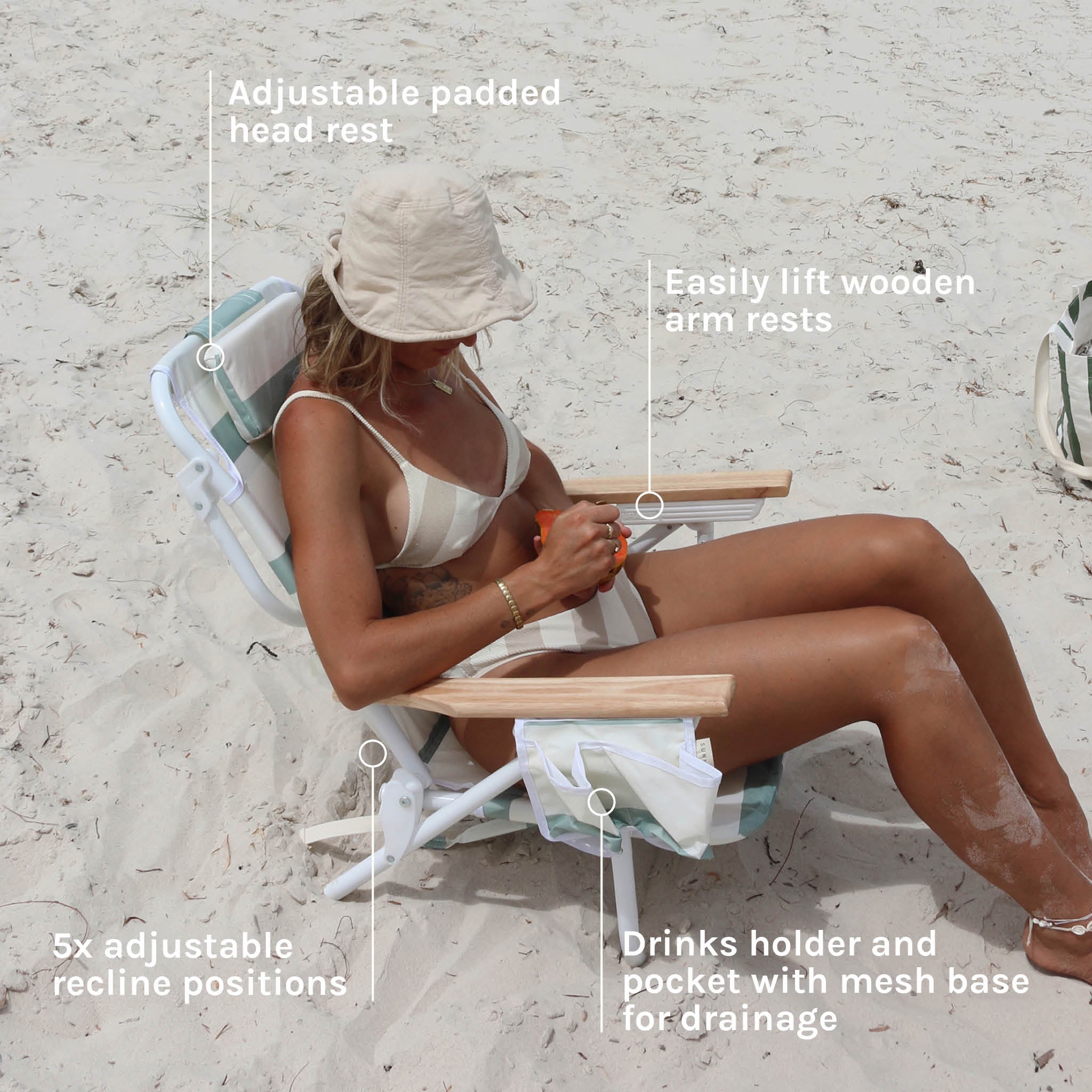 Easily carried as a backpack, this luxe chair features an insulated cooler pocket, mesh drainage storage, and a side drink holder perfect for seaside lounging.