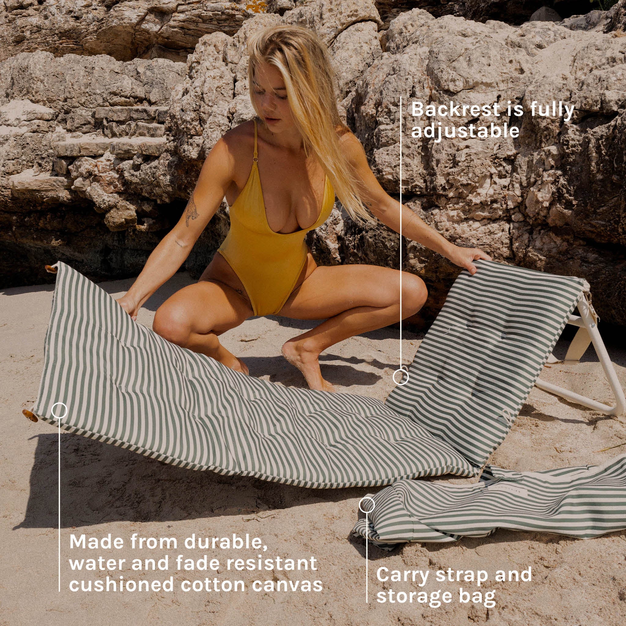 Recline in comfort with the ultimate outdoor chaise. The Vacay Beach Recliner is extremely comfortable and chic for long days spent under the sun. Made from durable, water and fade resistant cushioned cotton canvas and featuring an adjustable backrest for extra comfort, relaxing has never been so easy. From beach to park to pool, simply fold it out on any surface and claim your sunshine with its vintage look. Soak up your surroundings in style with its warm olive and cream maxi stripe print that will have you whisked away to island paradise.
