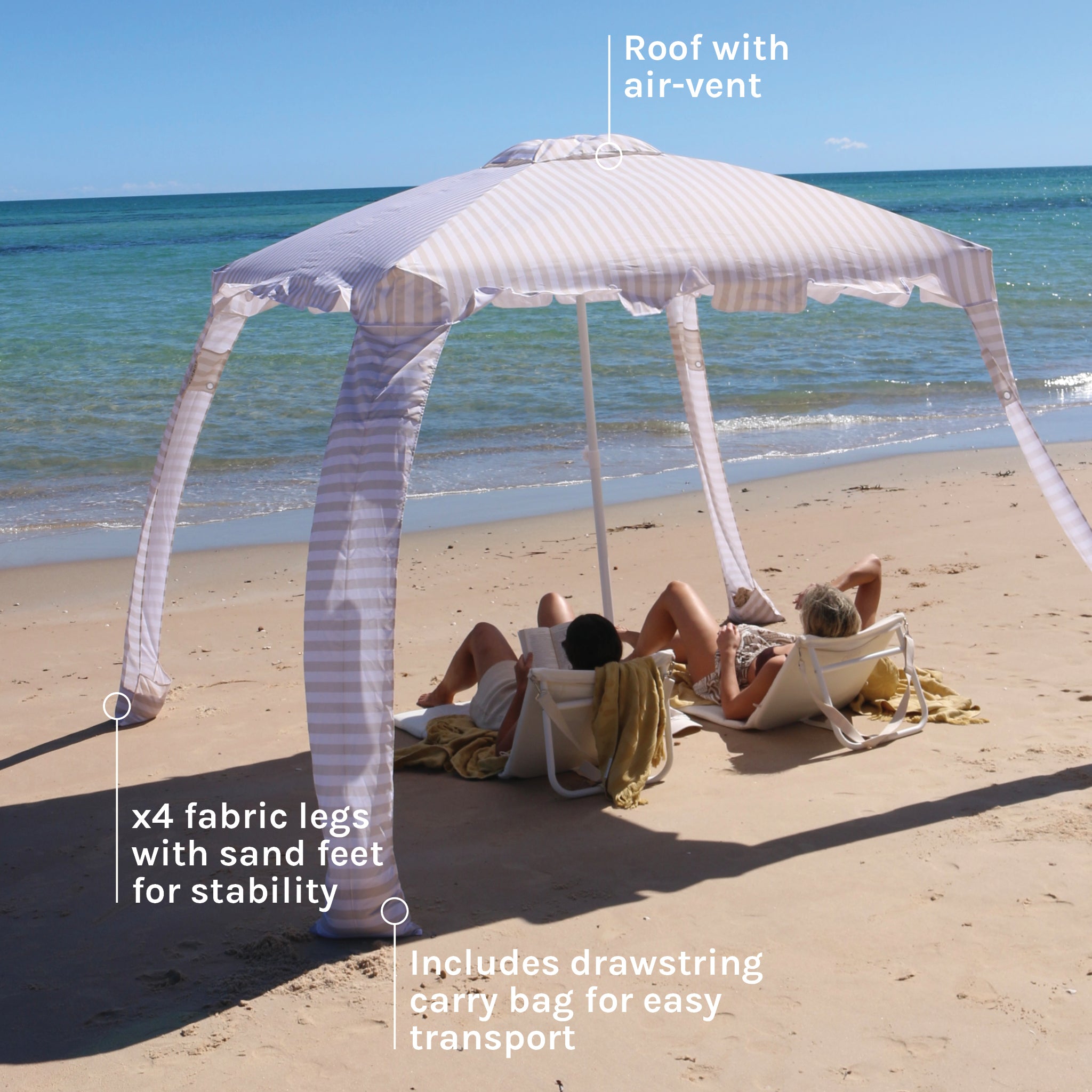 Seek shade for the whole family with the ultimate beachside oasis. The Le Weekend Beach Cabana is stylishly practical with plenty of space to lounge beneath its large canopy. Featuring a matching carry bag for transport and storage convenience, fiberglass reinforced structure, and an easy umbrella style setup mechanism. Take pleasure in soaking up the seascape in style with its classic blue and creamy white maxi stripe print that will have you feeling breezy from sunrise to sunset.