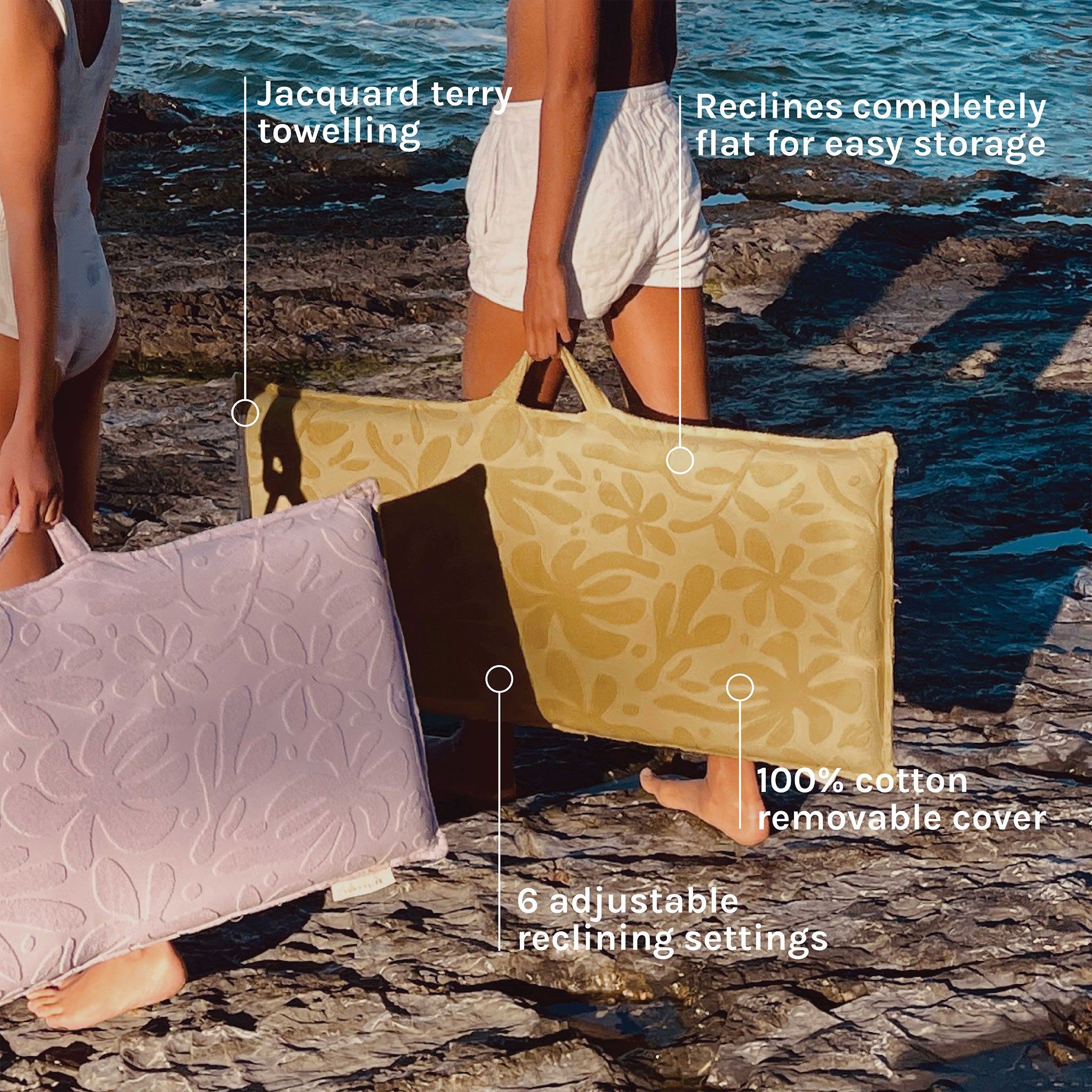 Recline in comfort with the ultimate outdoor seat. The Mango Bay Luxe Folding Seat is designed for advanced lounging with 6 adjustable reclining settings for sitting or lying back. Premium jacquard terry towelling and 100% combed cotton make this lounger chair ultra-soft and comfortable for all types of adventures. Plus, the terry cover is completely removable as well as machine washable and features a carry handle that allows for easy transport. Soak up your surroundings in style with its tropical foliage print and golden mustard hue that will have you mesmerised all day long.