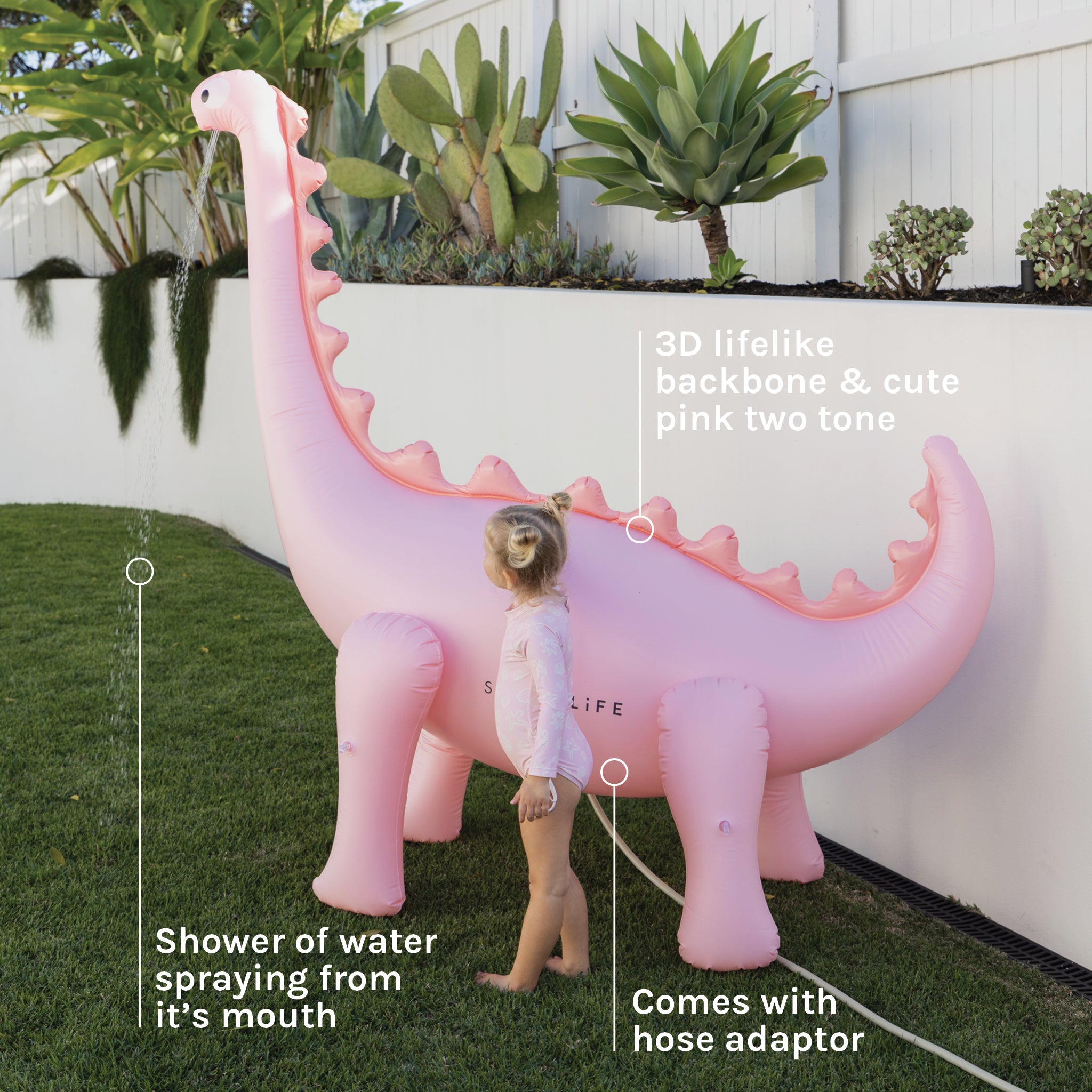 Sprinkle some fun for your little ones. The Into The Wild Dino Giant Sprinkler is designed to refresh hot summer days and provide hours of water filled playtime. Standing tall and proud at over 6 feet, this larger-than-life inflatable sprinkler is sure to be a hit with kids and adults alike. Simply attach to your garden hose and play beneath the sun shower of water spraying from its mouth. Every little one needs a summer companion and this one will definitely turn heads with its 3D lifelike backbone and playful pink hue.