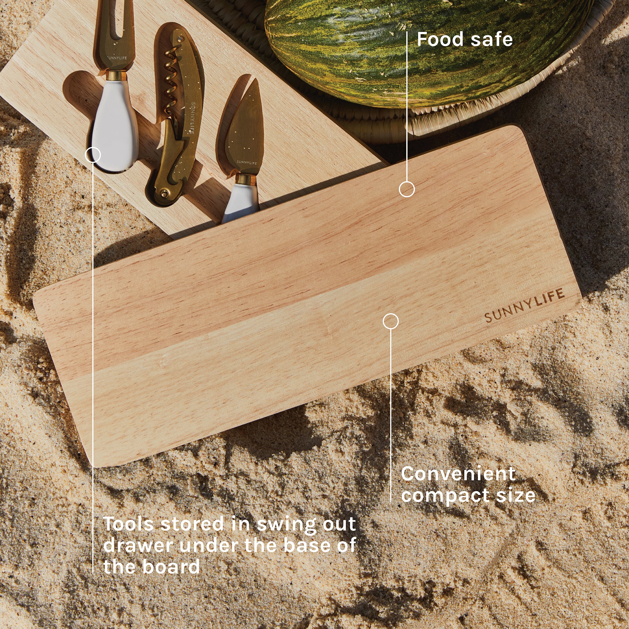 The Travel Cheese Board Set Perfect for picnics, this compact cheese board set includes a knife, fork with ceramic handle, and wine opener all neatly stored in a swing-out drawer beneath the food-safe board.