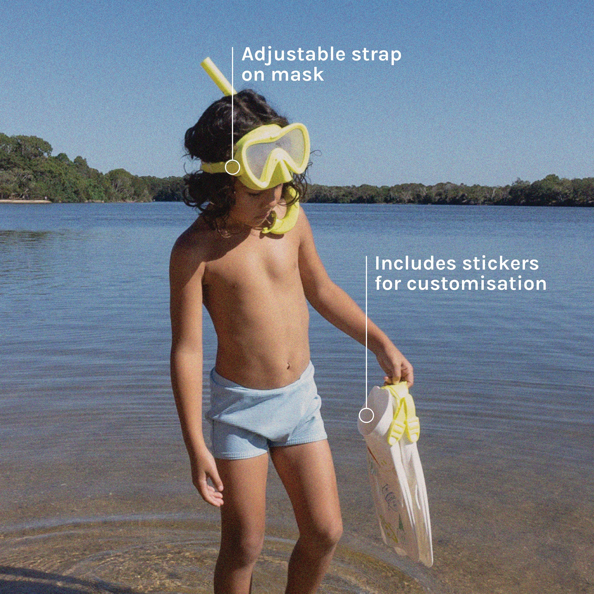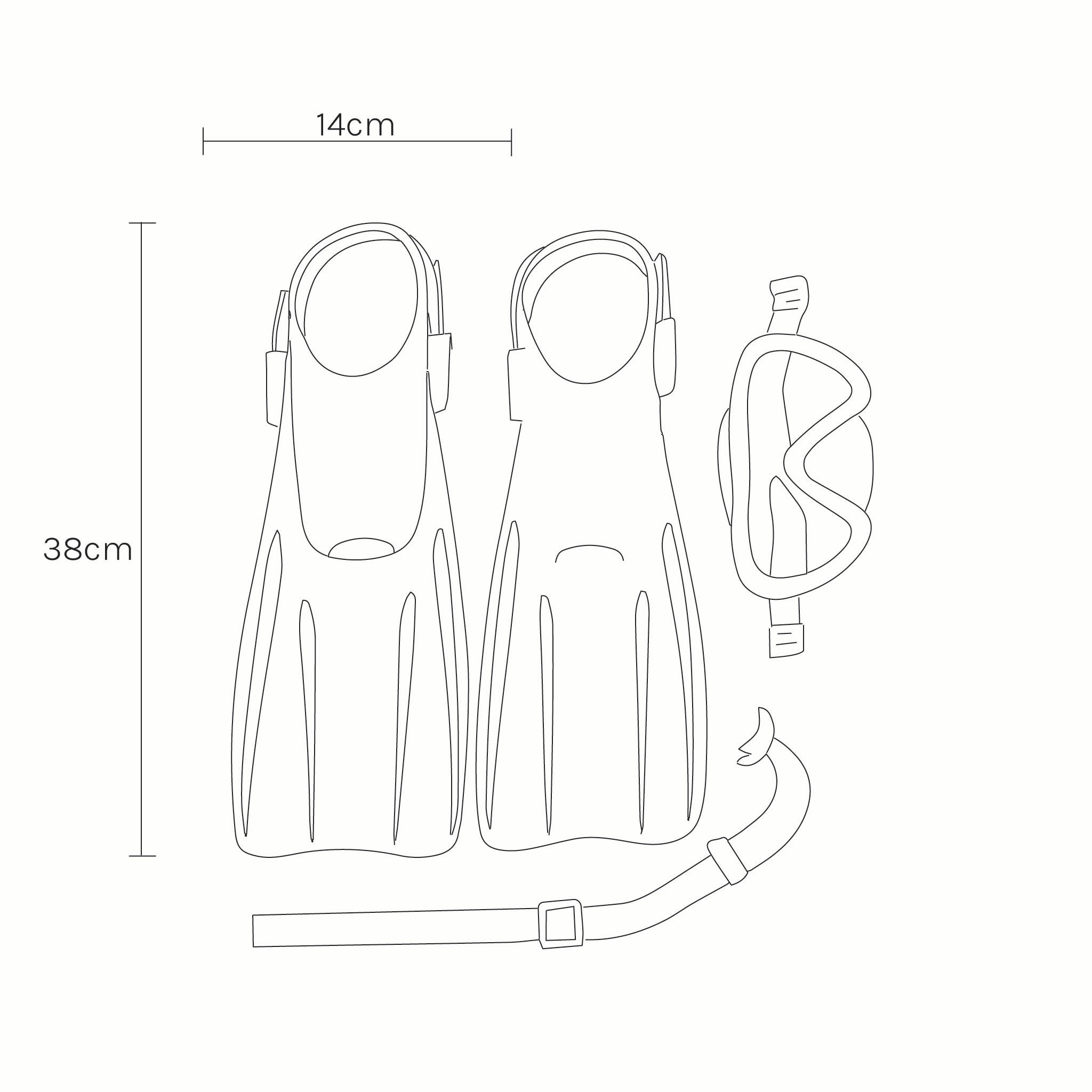 Dive deep into summer with the coolest swimming accessories. The Sea Kids Snorkel Set Medium is fun and practical, perfect for any water enthusiasts who want to explore the depths of the pool or ocean. Plunge in with this 5 piece beginners set equipped with a snorkel, adjustable mask, two adjustable flippers, and a handy mesh carry bag, ready to upgrade underwater adventures. Experience the best of summer and make it your own with its customisable skater boy waterproof sticker set and ocean-inspired hues. Suitable for kids shoe sizes EU 25-38, UK 3-5, US 4-6.