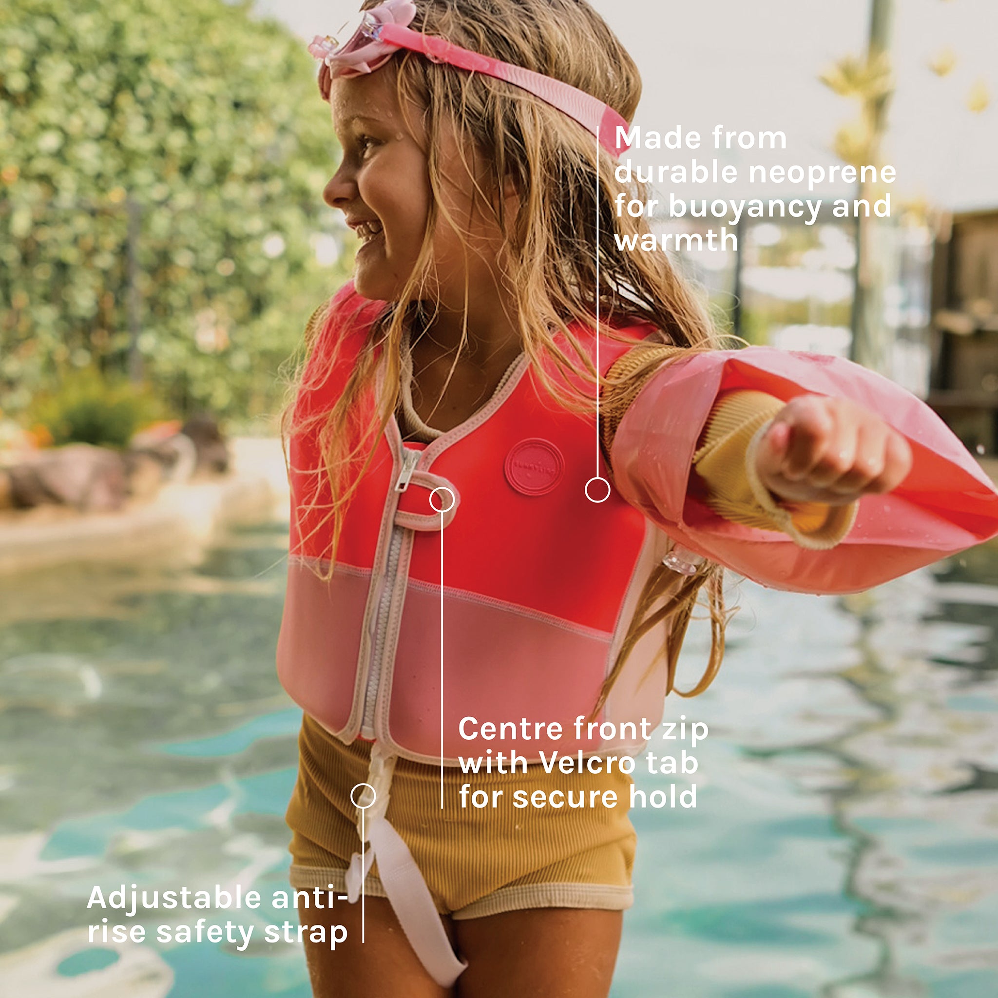 This Kids Swim Vest features an anti-rise safety strap, neoprene comfort guard, and secure zip with Velcro tab made from sustainable rubber to support safe, confident swimming in little learners.