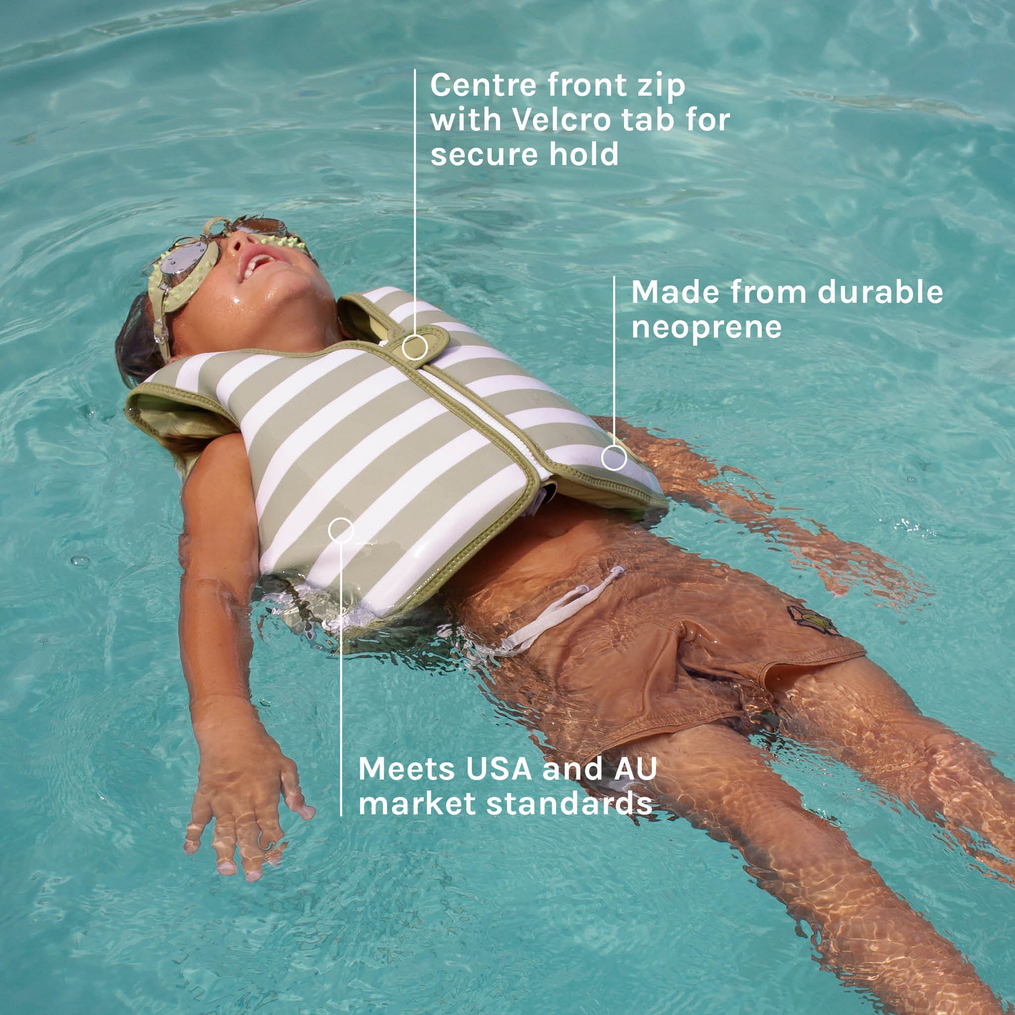 From paddling to pro, boost kids swim confidence. The Into The Wild Swim Vest 3-6 is cute, practical as well as comfortable and will be sure to make a splash wherever you go. Made from durable neoprene for buoyancy and warmth, simply zip the vest up from the front for a snug fit. Little ones will be sure to love the freedom this swim accessory offers them, from swimming to playing and building confidence in the water. Turn heads and ensure this season is one to remember with its trendy maxi stripe print, sharp scaled backbone, and cool khaki and cream colourway. Suitable for children aged 3-6 years old.