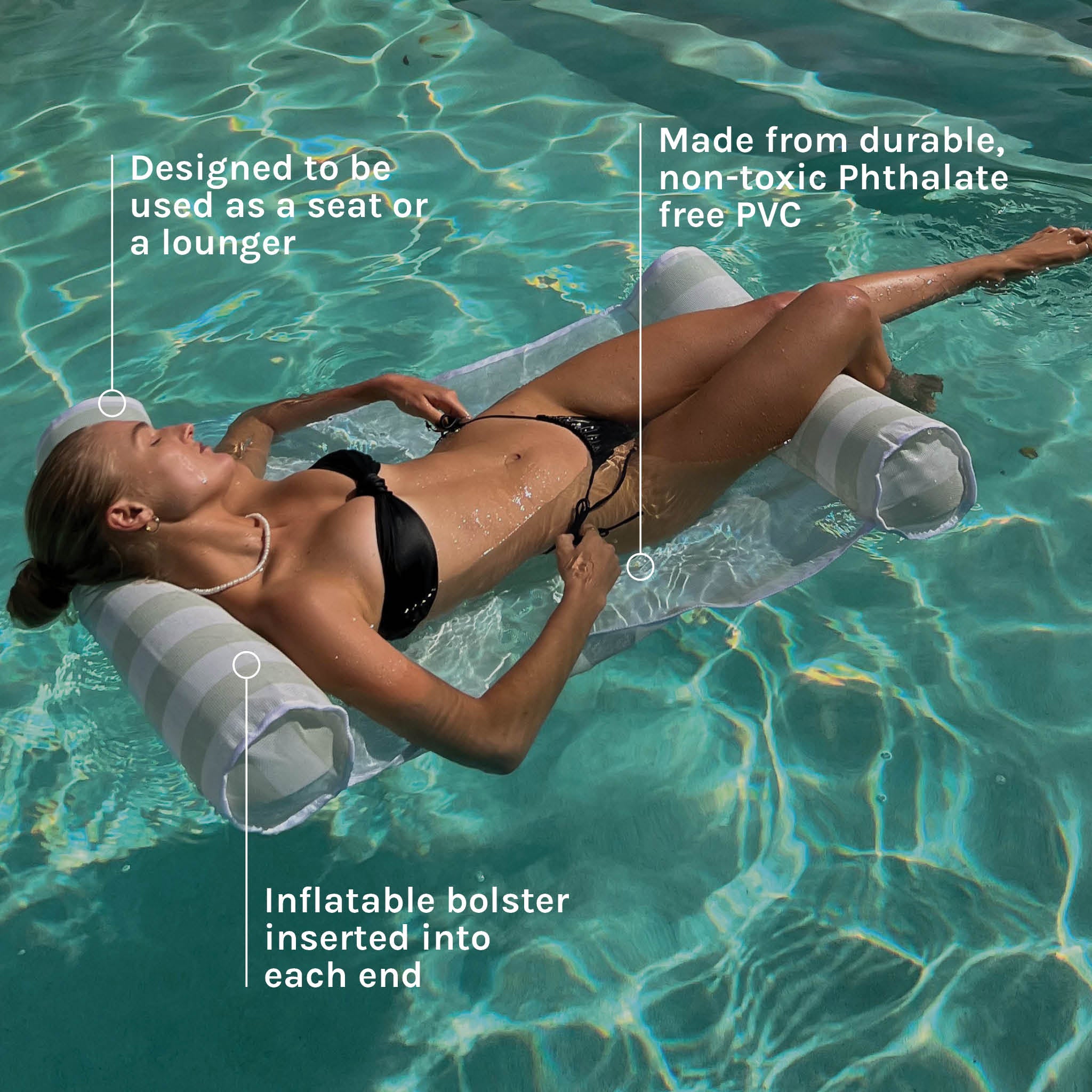 Retreat to paradise and soak up the summer sun. The Vacay Mesh Hammock Float is stylish, leisurely, and easy going, perfect for floating in the pool and long balmy days spent by the seaside. Designed to be enjoyed as both a seat and lounger, featuring a mesh centre and an inflatable tube on either end so you can be partially dipped in the water. Take delight in the simple pleasures of the tropics with its warm olive and cream maxi stripe print that will have you drifting into a daydream.
