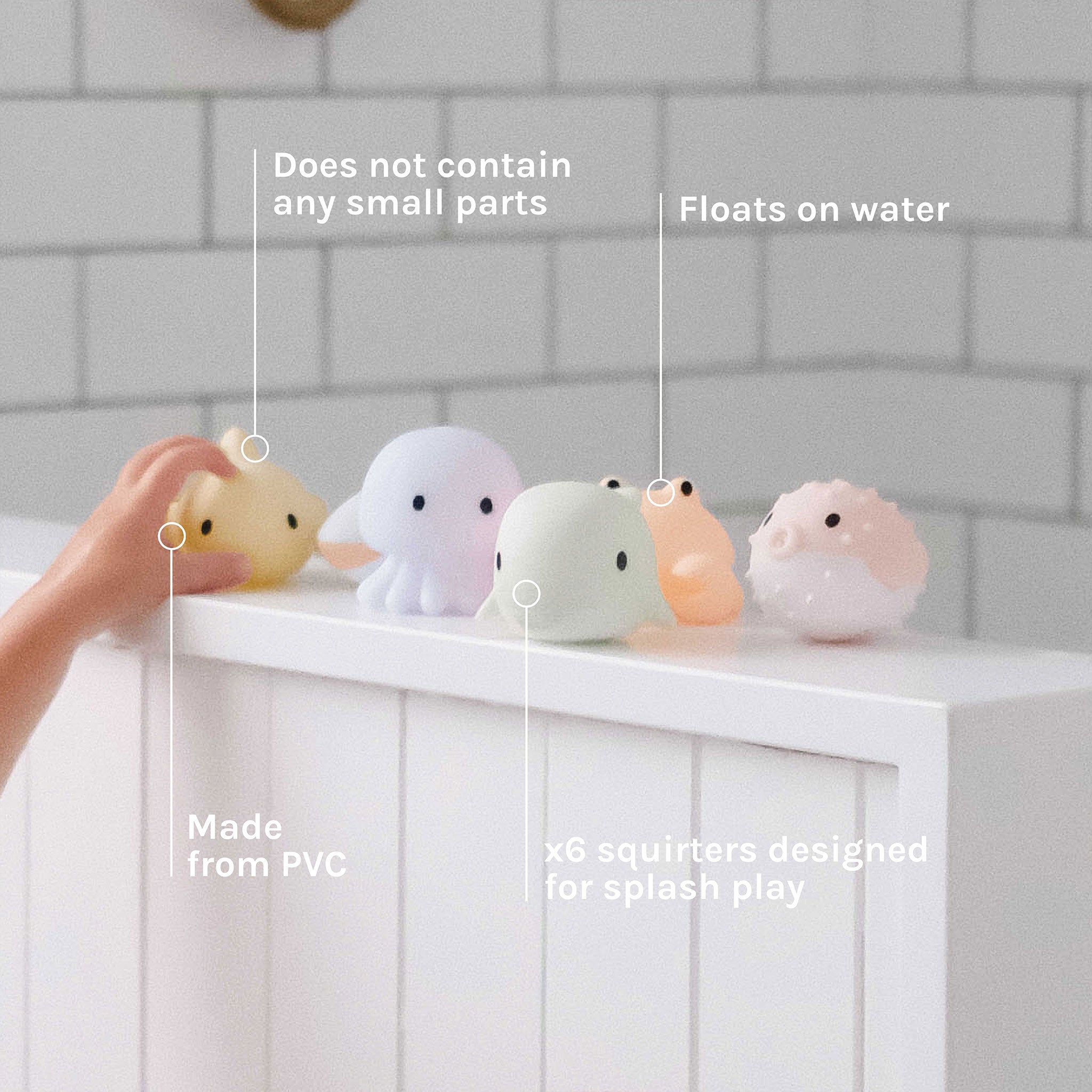 Make a splash with the cutest splash time accessories. The Sea Animal Splash Toys are designed to make bathing a fun and enjoyable experience for both parents and kids. Made from durable PVC, these soakers are guaranteed to put a smile on your child's face and capture their playful imaginations. Ensure tub time is the best time with this set of 6 underwater animal buddies including a puffer fish, whale, octopus, crab, fish, and shark washed over by sweet pastel tones.